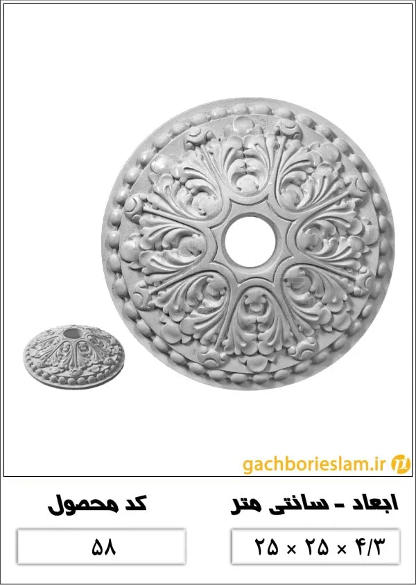 گچبری مرکزی 58 دور لوستری کلاسیک پیش ساخته گچی با ابعاد 25 سانتی متری زیبا بوده و متناسب به سلیقه مشتری هم به صورت تکی و هم ترکیبی نصب می شود .